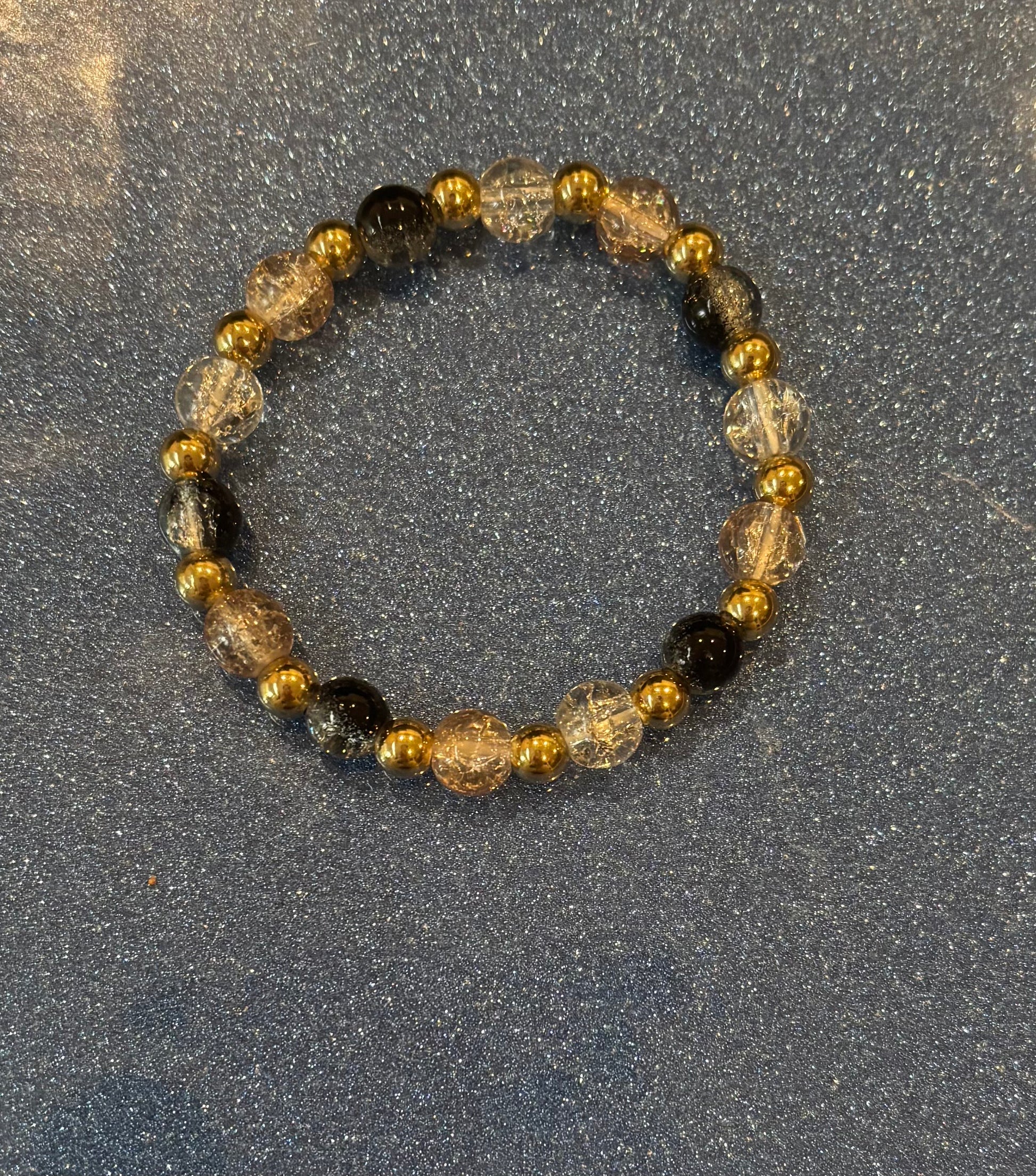 Bold and timeless, this bracelet blends smoky blacks, crystal-clear shimmer, and radiant gold — a perfect balance of mystery and elegance for day or night.